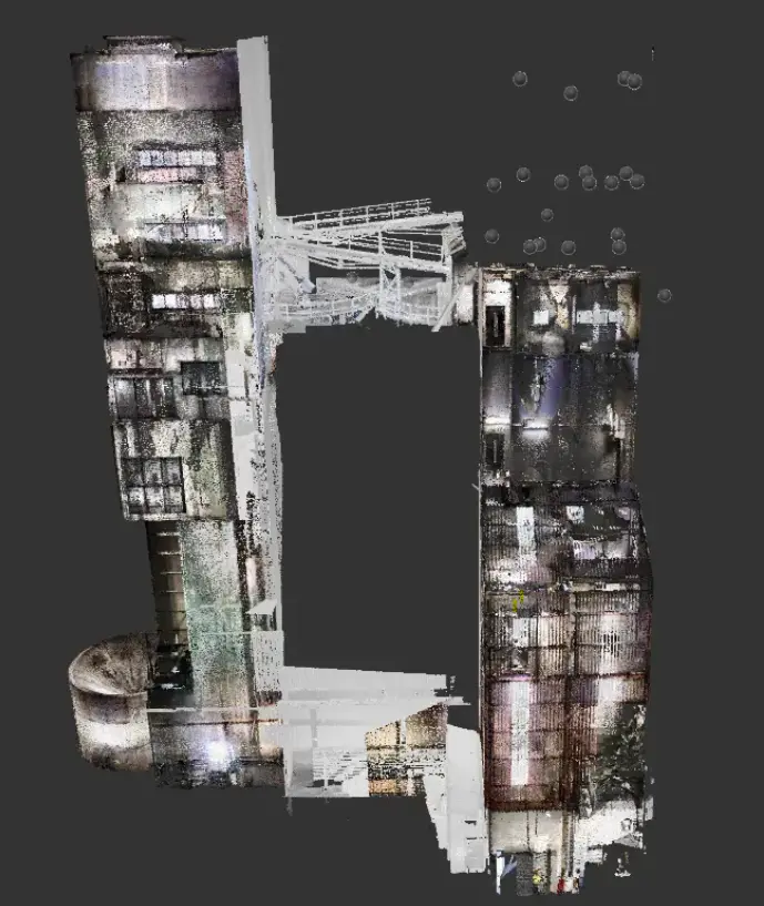 Mission : Relevé laser scanner complet du site, modélisation 3D détaillée du silo à grain et de ses installations techniques.